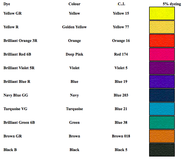 Economical strong brilliant colours. Suitable for special resist & discharge printing techniques in conjunction with Procion MX dyes.